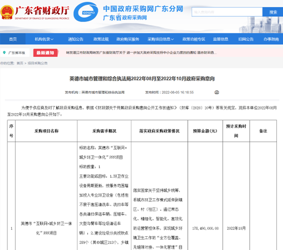 圖片來源:廣東省政府采購(gòu)廣東省政府采購(gòu)網(wǎng)消息,近日,英德市城市管理和綜合執(zhí)法局發(fā)布2022年08月至2022年10月政府采購(gòu)意向,英德市“互聯(lián)網(wǎng)+城鄉(xiāng)環(huán)衛(wèi)一體化”PPP項(xiàng)目計(jì)劃于2022年10月份開展政府采購(gòu)。采購(gòu)需求概況:1.環(huán)衛(wèi)作業(yè)設(shè)備周期更新,按服務(wù)范圍增加投入專業(yè)環(huán)衛(wèi)設(shè)備(包括但不限于高壓清...