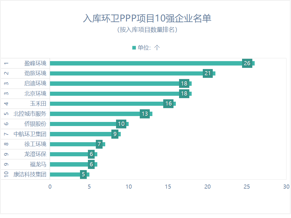 已入庫(kù)環(huán)衛(wèi)PPP項(xiàng)目領(lǐng)域,誰(shuí)是最大贏家?入庫(kù)項(xiàng)目:財(cái)政部政府和社會(huì)資本合作中心PPP項(xiàng)目庫(kù)可以查詢到的項(xiàng)目,包括項(xiàng)目管理庫(kù)和項(xiàng)目?jī)?chǔ)備清單。截止目前,已入庫(kù)、且已開標(biāo)的環(huán)衛(wèi)PPP項(xiàng)目總量為302個(gè)。按項(xiàng)目量計(jì)算,盈峰環(huán)境占入庫(kù)項(xiàng)目總量的12%在302個(gè)入庫(kù)且已開標(biāo)環(huán)衛(wèi)PPP項(xiàng)目中,盈峰環(huán)境入庫(kù)項(xiàng)目數(shù)量...