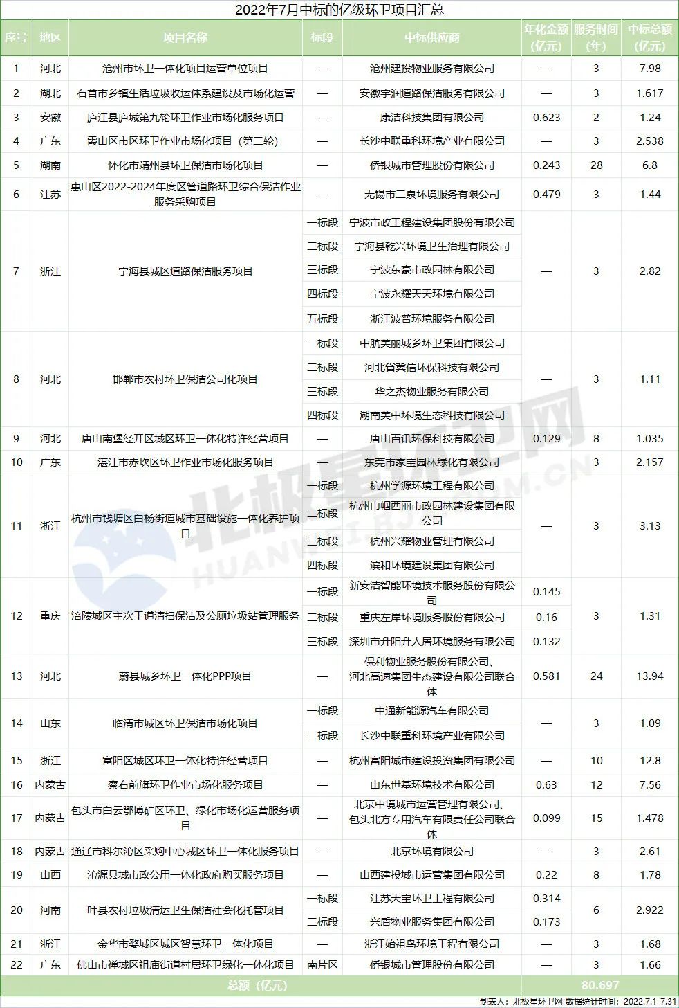 7月共開出2個(gè)10億+項(xiàng)目,分別是13.94億元的河北蔚縣城鄉(xiāng)環(huán)衛(wèi)一體化PPP項(xiàng)目和12.8億元的浙江富陽(yáng)區(qū)城區(qū)環(huán)衛(wèi)一體化特許經(jīng)營(yíng)項(xiàng)目,這兩個(gè)項(xiàng)目分別被保利物業(yè)、河北高速聯(lián)合體以及杭州富陽(yáng)城投收入囊中。項(xiàng)目匯總?cè)缦拢?1 河北、浙江、廣東三地仍然領(lǐng)先內(nèi)蒙古地區(qū)異軍突起眾所周知,河北、浙江、廣東地區(qū)環(huán)...