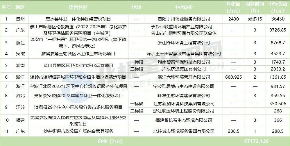 詳情如下:項(xiàng)目名稱:貴州省惠水縣環(huán)衛(wèi)一體化特許經(jīng)營(yíng)權(quán)項(xiàng)目中標(biāo)單位:貴陽(yáng)丁川偉業(yè)服務(wù)有限公司中標(biāo)金額:2430萬(wàn)元/年,最高36450萬(wàn)元服務(wù)時(shí)間:8+N(N最少不低于2年,最高不超過7年)服務(wù)內(nèi)容:特許經(jīng)營(yíng)范圍包括約291萬(wàn)平方米的城市各級(jí)道路及好花紅景區(qū)的日常清掃保潔,9個(gè)轉(zhuǎn)運(yùn)站的維護(hù)管理,城市建...