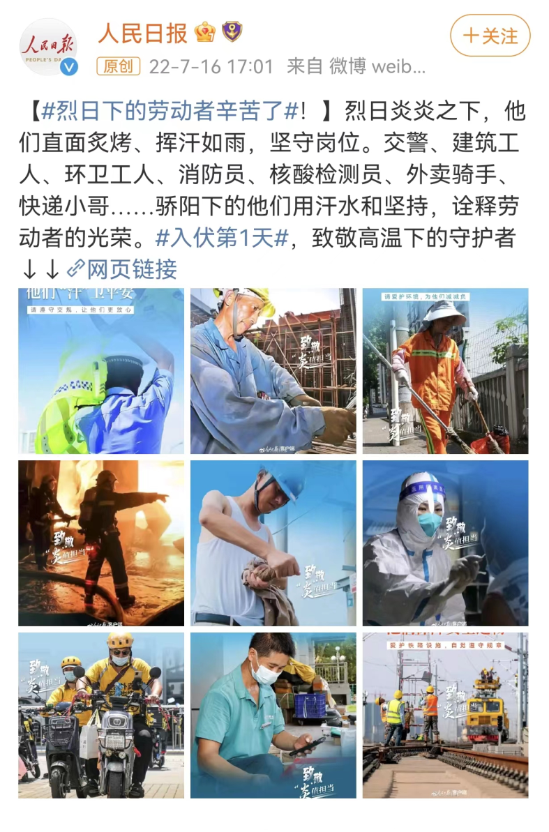 人民日?qǐng)?bào)7月16日消息,烈日炎炎之下,他們直面炙烤、揮汗如雨,堅(jiān)守崗位。交警、建筑工人、環(huán)衛(wèi)工人、消防員、核酸檢測(cè)員、外賣騎手、快遞小哥……驕陽(yáng)下的他們用汗水和堅(jiān)持,詮釋勞動(dòng)者的光榮。來(lái)源 | 人民日?qǐng)?bào)編輯 | 匡宋堯