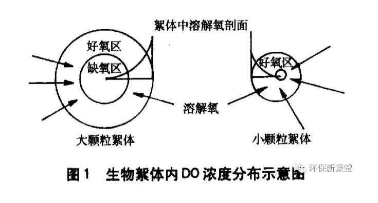 缺氧微環(huán)境理論是目前已被普遍接受的一種機(jī)理,被認(rèn)為是同步硝化/反硝化發(fā)生的主要原因之一。這一理論的基本觀點(diǎn)認(rèn)為:在活性污泥的絮體中,從絮體表面至其內(nèi)核的不同層次上,由于氧傳遞的限制原因,氧的濃度分布是不均勻的,微生物絮體外表面氧的濃度較高,內(nèi)層濃度較低。在生物絮體顆粒尺寸足夠大的情況下,可以在菌膠團(tuán)內(nèi)部形成缺氧區(qū),在這種情況下,絮體外層好氧硝化菌占優(yōu)勢,主要進(jìn)行硝化反應(yīng),內(nèi)層為異樣反硝化菌占優(yōu)勢,主要進(jìn)行反硝化反應(yīng)(如圖1)。除了活性污泥絮凝體外,一定厚度的生物膜中同樣可存在溶氧梯度,使得生物膜內(nèi)層形成缺氧微環(huán)境。