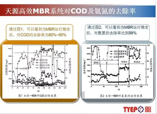 天源環(huán)保有10多年的深入摸索,對內(nèi)置式MBR,外置式MBR分別具備大量工程應(yīng)用,對其優(yōu)缺點(diǎn)很明顯,并且針對性解決各自的瓶頸問題。由上圖可以看到當(dāng)MBR運(yùn)行穩(wěn)定后,對COD的去除率為80%~90%,對氨氮的去除率達(dá)到99%。