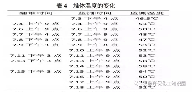 一般認(rèn)為高溫菌對(duì)有機(jī)物的降解效率高于中溫菌,但溫度過高,容易導(dǎo)致嗜熱菌的死亡,從而影響處理效果,高溫堆肥最高溫度一般控制在65℃以下。堆肥過程中堆體溫度變化見表4。