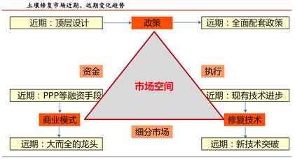 政策層面。長期尺度下,政策層面最值得期待的驅(qū)動(dòng)因素是在土壤修復(fù)所有領(lǐng)域、全國大部分區(qū)域的配套性政策全面出臺(tái)。與短期尺度相比,長期尺度下政府必須向治理難度更大、經(jīng)濟(jì)效益更弱的修復(fù)任務(wù)“開刀”。