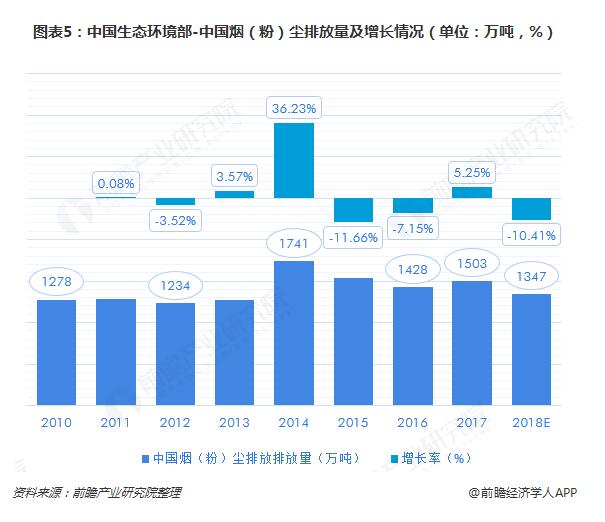 煙(粉)塵排放量在2014年達(dá)到1741萬噸的排放高峰后,近年來整體下滑。2017年的排放量在1503萬噸左右。