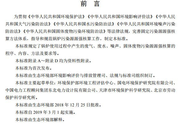 為貫徹《中華人民共和國環(huán)境保護(hù)法》《中華人民共和國環(huán)境影響評價法》《中華人民共和國大氣污染防治法》《中華人民共和國水污染防治法》《中華人民共和國環(huán)境噪聲污染防治法》《中華人民共和國固體廢物污染環(huán)境防治法》等法律法規(guī),完善固定污染源源強(qiáng)核算方法體系,指導(dǎo)和規(guī)范鍋爐污染源源強(qiáng)核算工作,制定本標(biāo)準(zhǔn)。本標(biāo)準(zhǔn)規(guī)定了鍋爐使用過程中產(chǎn)生的廢氣、廢水、噪聲、固體廢物污染源源強(qiáng)核算的程序、內(nèi)容、方法及要求等。本標(biāo)準(zhǔn)附錄A~附錄D均為資料性附錄。本標(biāo)準(zhǔn)為首次發(fā)布。