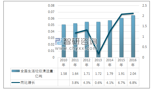 2010-2016年全國生活垃圾清運(yùn)量及增長率