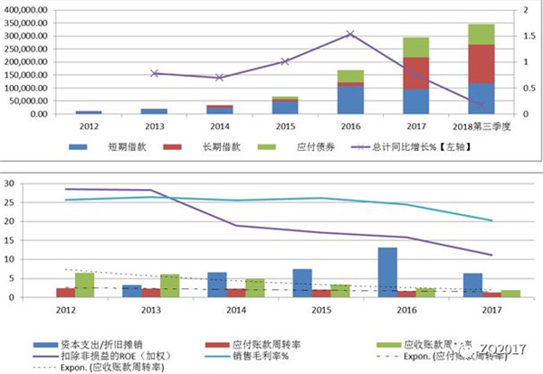 截至2018年第三季度,公司在建工程賬面余額約406,115萬元,是同期固定資產(chǎn)賬面價(jià)值的53倍,主要通過PPP業(yè)務(wù)模式開展。隨著業(yè)務(wù)擴(kuò)張,近幾年公司的資本支出水平明顯, 2016年的資本支出/折舊攤銷高達(dá)13,同期的負(fù)債水平也明顯上升。2017年公司加大長期借款額度,長期負(fù)債占比上升至32,同比增加約50%。但企業(yè)的營運(yùn)資金效率水平欠缺,自2016年,長期債務(wù)/營運(yùn)資金比例明顯增加,2017年比值接近202,償債壓力顯現(xiàn)。而2015-2017年企業(yè)的經(jīng)營現(xiàn)金流凈額呈現(xiàn)負(fù)值,盈利空間下滑,而2016、2017的應(yīng)收賬款占比在50%以上,且回款率有所降低,壞賬風(fēng)險(xiǎn)增加?;诖?,公司未來的產(chǎn)能釋放和成本控制將對公司可持續(xù)經(jīng)營起到關(guān)鍵作用。2017年年報(bào)顯示公司的多個(gè)項(xiàng)目已經(jīng)完工轉(zhuǎn)入固定資產(chǎn),2018-2019年將開始投產(chǎn)。某種程度上和公司的組織調(diào)整相呼應(yīng)。
