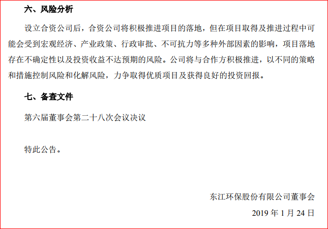 2019年1月24日,東江環(huán)保股份有限公司董事會發(fā)布公告稱,擬出資成立合資公司,打造一家專業(yè)化的環(huán)保服務(wù)企業(yè)。