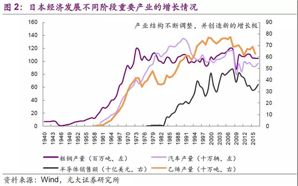 20世紀(jì)70年代起,尼克松沖擊、兩次石油危機(jī)以及廣場(chǎng)協(xié)議,致日本經(jīng)濟(jì)面臨較大的考驗(yàn)。1974年是日本經(jīng)濟(jì)第一個(gè)重要的分界點(diǎn),對(duì)于資源貧乏和市場(chǎng)狹窄的日本來說,期初人口及原材料廉價(jià)的優(yōu)勢(shì)已經(jīng)消失,只有通過產(chǎn)業(yè)結(jié)構(gòu)的升級(jí),發(fā)展節(jié)能和精細(xì)化高附加值的產(chǎn)品,才能實(shí)現(xiàn)日本企業(yè)競(jìng)爭(zhēng)力進(jìn)一步提升。在此期間,日本汽車、半導(dǎo)體產(chǎn)業(yè)的騰飛便是一個(gè)很好的例子,新的增長(zhǎng)極的出現(xiàn),也將石油危機(jī)、資源約束的影響降到較低的水平。