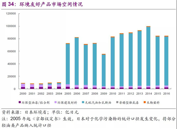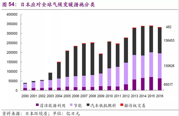 在日本應(yīng)對(duì)全球氣候變暖措施分類上,主要有清潔能源利用、節(jié)能、汽車低耗燃料等具體措施,2016年整體的市場(chǎng)空間可以達(dá)33萬億日元(日本環(huán)境省數(shù)據(jù))。具體細(xì)分來看,以2016年為例,節(jié)能建筑、低油耗低排放及混合動(dòng)力車輛、太陽能產(chǎn)業(yè)、蓄電池、節(jié)能照明設(shè)施等是未來重要的發(fā)展方向。