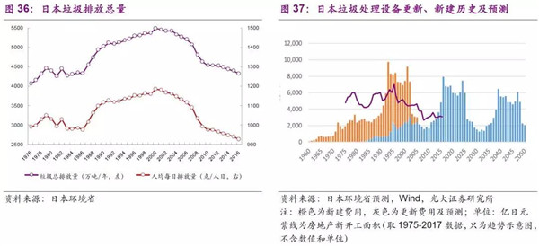 整體上看,2000年后隨著循環(huán)經(jīng)濟(jì)制度的推行,疊加經(jīng)濟(jì)周期和產(chǎn)業(yè)結(jié)構(gòu)的不斷變化,日本垃圾的總排放量、人均排放量均呈現(xiàn)減少趨勢(shì),而垃圾處理設(shè)備周期也和工業(yè)化、城鎮(zhèn)化及房地產(chǎn)周期密切相關(guān)。