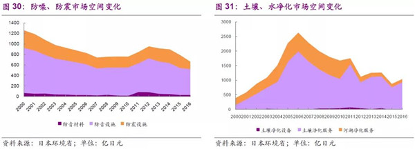 日本的防噪、防震措施分為設(shè)備與材料市場(chǎng),2016年總市場(chǎng)空間為762億日元,其中防音設(shè)施、防震設(shè)施占比較高,分別為492、233億日元;日本的土壤和水質(zhì)凈化分為設(shè)備及服務(wù)市場(chǎng),設(shè)備需求較弱,主要是以服務(wù)方式體現(xiàn),2016年土壤凈化服務(wù)市場(chǎng)為942億日元,河湖凈化服務(wù)為95億日元。