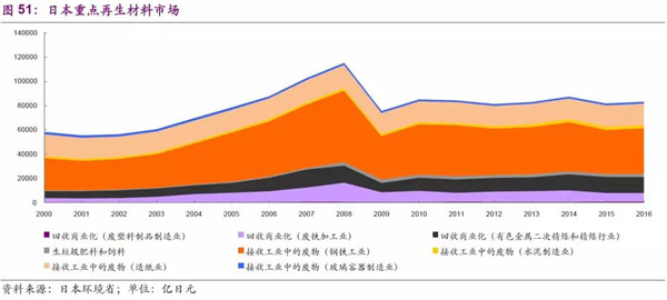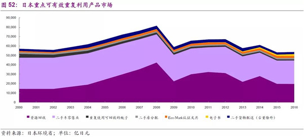 2016年,再生材料整體市場(chǎng)為8.47萬億日元,其中鋼鐵、有色、造紙回收分別為3.80、1.34、1.77萬億日元;可有效重復(fù)利用產(chǎn)品總市場(chǎng)為5.44萬億日元,其中二手車零售和一般資源回收2.50、1.99萬億日元。