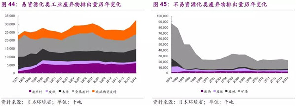 以易資源化和不易資源化來劃分工業(yè)垃圾產(chǎn)生量:易資源化廢棄物主要隨著日本工業(yè)化和城鎮(zhèn)化興起而產(chǎn)量增加,同時(shí)即便在經(jīng)濟(jì)周期的下行周期,其變化也并不是很顯著;而不易資源化的工業(yè)垃圾如部分重工業(yè)產(chǎn)生的廢酸、廢堿、礦渣等排出量卻會(huì)隨著經(jīng)濟(jì)周期的下行發(fā)生一定幅度的減少。這也說明在20世紀(jì)80年代后期,日本的產(chǎn)業(yè)結(jié)構(gòu)正逐漸發(fā)生著變化,傳統(tǒng)的重污染行業(yè)正在逐漸減少或進(jìn)行節(jié)能環(huán)保轉(zhuǎn)型、新興產(chǎn)業(yè)正在興起。