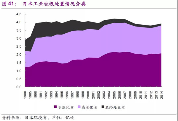 日本工業(yè)垃圾處理更為深刻的踐行了循環(huán)型社會(huì)路線,根據(jù)2014年日本環(huán)境省數(shù)據(jù),工業(yè)垃圾排放量為3.92億噸,資源化、減量化、最終處置量分別為2.10、1.72、0.10億噸,其中資源化占比高達(dá)53.6%。
