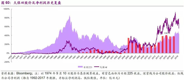 我們對(duì)公司1974-2018年的股價(jià)及凈利潤(rùn)進(jìn)行了復(fù)盤。公司作為的全球農(nóng)業(yè)機(jī)械和環(huán)境領(lǐng)域設(shè)備制造商,受經(jīng)濟(jì)周期性影響較為顯著,具有典型的周期股屬性。公司上市后的早期階段持續(xù)跑輸大盤,在20世紀(jì)80年代末資產(chǎn)泡沫階段,表現(xiàn)也較為低迷;2003-2007年全球經(jīng)濟(jì)繁榮,尤其是中國(guó)和北美的業(yè)務(wù)帶動(dòng)公司業(yè)務(wù)進(jìn)一步發(fā)展,公司業(yè)績(jī)穩(wěn)步提升(2005年的業(yè)績(jī)提升主要系收到了586億日元養(yǎng)老金替代計(jì)劃的政府補(bǔ)助),股票開始獲得超額收益;隨后受次貸危機(jī)影響,公司股價(jià)隨業(yè)績(jī)同步走低,直到2012年后日元貶值至出口轉(zhuǎn)好,疊加全球經(jīng)濟(jì)回暖北美和東南亞銷售回暖,公司在2013-2014年的業(yè)績(jī)才顯著轉(zhuǎn)好;此后公司股價(jià)隨日本股市整體上漲,表現(xiàn)優(yōu)異至今。