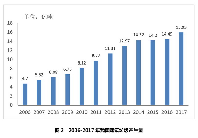 按照我國(guó)《民用建筑設(shè)計(jì)通則》,重要建筑和高層建筑主體結(jié)構(gòu)的耐久年限為100年,一般建筑為50~100年?!笆晃濉逼陂g,全國(guó)共有46億平方米建筑被拆除,其中20億平方米建筑在拆除時(shí)壽命小于40年。據(jù)測(cè)算,每10000平米建筑施工面積平均產(chǎn)生550噸建筑垃圾,建筑施工面積對(duì)城市建筑垃圾產(chǎn)量的貢獻(xiàn)率為48%。保守估計(jì),2017年全國(guó)共計(jì)產(chǎn)生建筑垃圾15.93億噸。