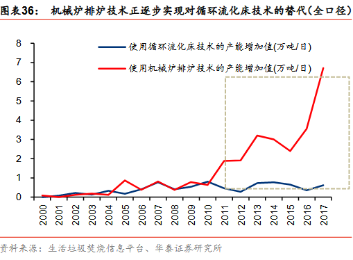 國際上機(jī)械爐排爐技術(shù)已經(jīng)非常成熟并且被廣泛使用,相比循環(huán)流化床技術(shù),機(jī)械爐排爐技術(shù)擁有單臺(tái)焚燒爐的垃圾處理量大、進(jìn)料垃圾不需要進(jìn)行預(yù)處理、對垃圾的成分要求低、污染物排放和灰渣熱灼減率等指標(biāo)更易達(dá)標(biāo)、燃燒狀態(tài)穩(wěn)定、運(yùn)行成本低、年運(yùn)行時(shí)間長、操作簡便等優(yōu)勢。而國內(nèi)2012年發(fā)布的《國家發(fā)展改革委關(guān)于完善垃圾焚燒發(fā)電價(jià)格政策的通知》和2014年發(fā)布的《生活垃圾焚燒污染控制標(biāo)準(zhǔn)》等政策也使得循環(huán)流化床技術(shù)的運(yùn)行成本增加,因而近年來機(jī)械爐排爐技術(shù)正在逐步實(shí)現(xiàn)對循環(huán)流化床技術(shù)的替代。