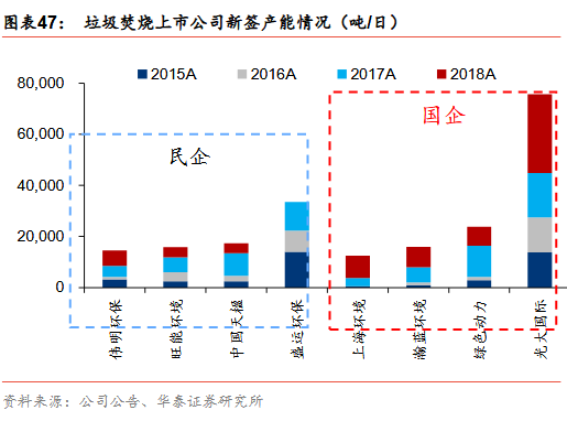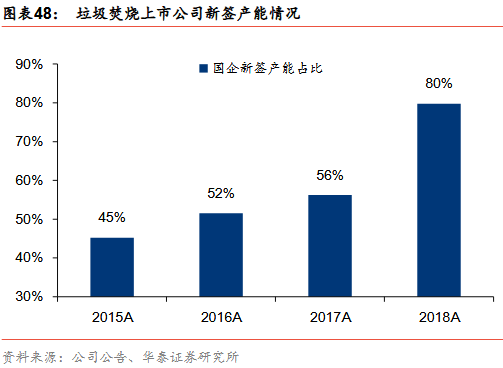 新增訂單趨勢:國企拿單能力強(qiáng)于民企。我們對光大國際、綠色動(dòng)力、瀚藍(lán)環(huán)境、上海環(huán)境、盛運(yùn)環(huán)保、中國天楹、旺能環(huán)境、偉明環(huán)保幾家典型垃圾發(fā)電上市公司2015-2018年新簽訂單進(jìn)行分析,其中光大國際、綠色動(dòng)力、瀚藍(lán)環(huán)境、上海環(huán)境四家國企2015年新簽訂單1.8萬噸/日,占8家上市公司新簽訂單總產(chǎn)能的45%,2016年提升至52%、2017年繼續(xù)提升至56%,2018年四家國企新簽訂單總產(chǎn)能為5.5萬噸/日,占比提升至80%,國企拿單能力顯著強(qiáng)于民企。