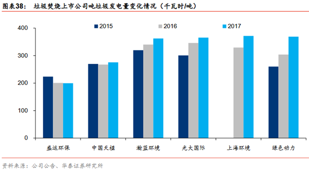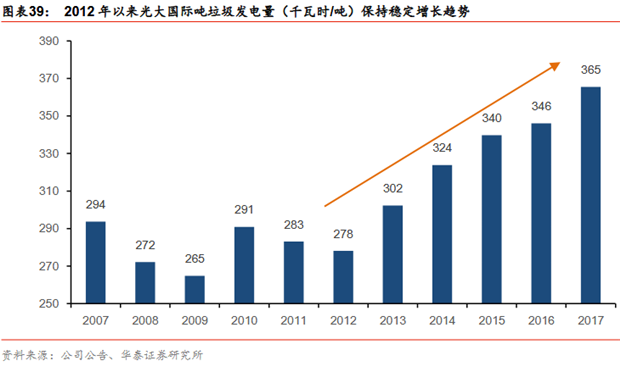 垃圾分類+技術(shù)的進(jìn)步=噸垃圾發(fā)電量提升,上市公司層面可以觀察到幾家典型垃圾發(fā)電企業(yè)在2015-2017年噸垃圾發(fā)電量顯著提升,其中綠色動(dòng)力、光大國際分別由16年的260千瓦時(shí)/噸、301千瓦時(shí)/噸提升至17年的369千瓦時(shí)/噸、365千瓦時(shí)/噸。長周期來看,光大國際噸垃圾發(fā)電量由2012年的278千瓦時(shí)/噸提升至2017年的365千瓦時(shí)/噸,提升幅度明顯。