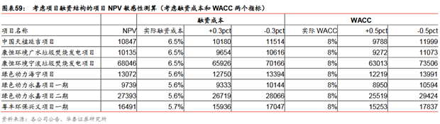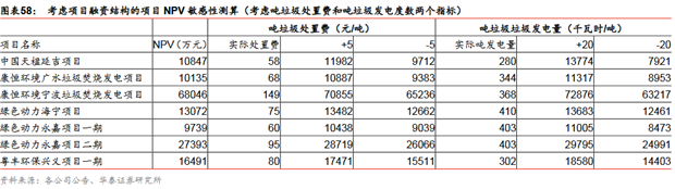 典型項(xiàng)目的NPV考慮項(xiàng)目融資結(jié)構(gòu)的項(xiàng)目NPV測算:我們假設(shè)項(xiàng)目的資本結(jié)構(gòu)為70%債務(wù),30%自有資金,參考中國天楹/綠色動(dòng)力的公司財(cái)務(wù)狀況,假設(shè)其項(xiàng)目的債務(wù)資金的綜合成本分別為6.5%/5.6%,各個(gè)項(xiàng)目每年將新增部分財(cái)務(wù)費(fèi)用。依據(jù)之前的投資數(shù)據(jù)和現(xiàn)金流數(shù)據(jù),我們計(jì)算得到各個(gè)項(xiàng)目考慮融資杠桿后的NPV,其中最高的為康恒寧波項(xiàng)目,其NPV為6.8億元,主要是因?yàn)槠鋰嵗幹觅M(fèi)高于其他所有項(xiàng)目,并且噸垃圾發(fā)電量也處于相對較高水平;而天楹延吉項(xiàng)目、康恒廣水項(xiàng)目、綠色動(dòng)力海寧、綠色動(dòng)力永嘉項(xiàng)目一期的NPV均較低,分別為1.08億元、1.01億元、1.31億元、0.97億元,主要因?yàn)榍皟蓚€(gè)項(xiàng)目的噸垃圾處置費(fèi)和噸垃圾發(fā)電量均較低,而后兩個(gè)項(xiàng)目的噸垃圾處置費(fèi)較低。我們再次計(jì)算了各項(xiàng)目的單位產(chǎn)能NPV,發(fā)現(xiàn)天楹延吉項(xiàng)目、康恒廣水項(xiàng)目、綠色動(dòng)力永嘉項(xiàng)目一期的該指標(biāo)分別僅有13.56萬元/噸、16.89萬元/噸、19.48萬元/噸,而康恒寧波項(xiàng)目、綠色動(dòng)力永嘉項(xiàng)目二期、綠色動(dòng)力海寧項(xiàng)目則分別達(dá)到30.24萬元/噸、28.83萬元/噸、26.14萬元/噸,再一次反映了后三個(gè)項(xiàng)目相對更高的噸垃圾處置費(fèi)和噸垃圾發(fā)電量所帶來的更高的項(xiàng)目價(jià)值。根據(jù)我們的敏感性分析,假設(shè)垃圾處置費(fèi)增加5元/噸,各個(gè)垃圾發(fā)電項(xiàng)目的NPV增加410-2809萬元;噸垃圾發(fā)電增加20千瓦時(shí)/噸,各個(gè)項(xiàng)目的NPV增加區(qū)間為611-4830萬元。我們考慮融資成本和WACC兩個(gè)指標(biāo)再次對各個(gè)項(xiàng)目的NPV進(jìn)行敏感性分析,發(fā)現(xiàn)融資成本增加0.3pct時(shí), 各個(gè)項(xiàng)目的NPV降低322萬元-2120萬元;WACC增加0.5pct時(shí),各個(gè)項(xiàng)目的NPV降低789萬元-5033萬元。