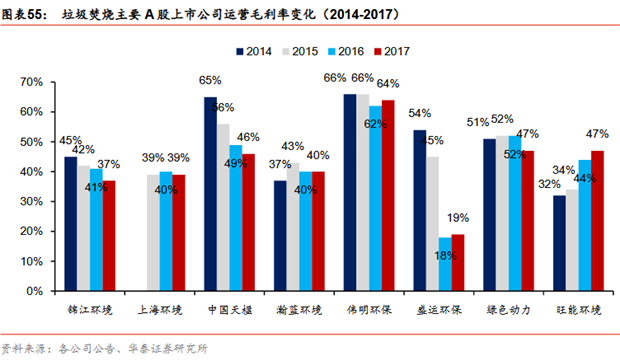 上市公司會(huì)計(jì)政策差異:垃圾焚燒會(huì)計(jì)處理方法各不相同。下面我們選取了行業(yè)里一些主要的上市公司分析,匯總?cè)缦卤恚渲校築OT計(jì)入工程收入的主要有錦江環(huán)境、光大國際、上海環(huán)境、瀚藍(lán)環(huán)境、盛運(yùn)環(huán)保、綠色動(dòng)力;BOT計(jì)入設(shè)備銷售收入的主要有:光大國際、中國天楹、偉明環(huán)保、盛運(yùn)環(huán)保,其中偉明環(huán)保的設(shè)備銷售的毛利率較高,大約在46%左右;各公司的運(yùn)營毛利率有一定差異,大部分公司2016年毛利率出現(xiàn)了同比下滑,預(yù)計(jì)由于新投運(yùn)項(xiàng)目的盈利能力不如老項(xiàng)目所致。其中偉明環(huán)保垃圾發(fā)電項(xiàng)目毛利率高出行業(yè)平均較多,主要是因?yàn)樵O(shè)備折舊費(fèi)用少,設(shè)備折舊費(fèi)用可以占到垃圾焚燒成本的40%-50%,而偉明環(huán)保的設(shè)備折舊較少主要有兩點(diǎn)原因:1)偉明環(huán)保自產(chǎn)爐排爐設(shè)備,同時(shí)不計(jì)設(shè)備銷售收入,因此在在建工程確認(rèn)時(shí)并不包含設(shè)備毛利(一般設(shè)備毛利率約40%),因此最終轉(zhuǎn)入無形資產(chǎn)特許經(jīng)營權(quán)的金額比其他公司大約節(jié)省了40%的設(shè)備投資;2)偉明環(huán)保采取的折舊方法是按照特許經(jīng)營權(quán)年限折舊,按照2016年特許經(jīng)營權(quán)折舊的數(shù)據(jù)估計(jì),綜合折舊年限在25年,折舊年限長于啟迪桑德、瀚藍(lán)環(huán)境、中國天楹、光大國際(這些公司采取特許經(jīng)營權(quán)和資產(chǎn)使用年限孰短的方法折舊,一般綜合折舊年限為20年)。