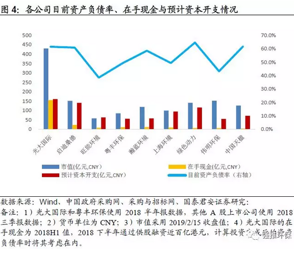 融資能力是公司焚燒產(chǎn)能兌現(xiàn)的關(guān)鍵,關(guān)注龍頭公司資產(chǎn)負(fù)債表擴(kuò)張彈性。前文分析垃圾焚燒產(chǎn)能擴(kuò)張資所需的本開支較大,未來需要重點(diǎn)關(guān)注融資能力與儲(chǔ)備產(chǎn)能釋放的匹配度,篩選在手現(xiàn)金充足或者現(xiàn)有資產(chǎn)負(fù)債率低的公司尤為重要:1)光大國際,2018完成百億供股募資,在手現(xiàn)金充沛;2)旺能環(huán)境、偉明環(huán)保,截至三季報(bào)資產(chǎn)負(fù)債率僅有38%和43%;3)上海環(huán)境、瀚藍(lán)環(huán)境,國企融資優(yōu)勢(shì)突出同時(shí)資產(chǎn)負(fù)債率可控。