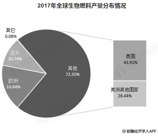 從2017年全球各區(qū)域生物燃料產(chǎn)量分布來看,主要集中在以美國(guó)為主的美洲國(guó)家,2017年達(dá)到了6085.9萬(wàn)噸當(dāng)油量,全球占比達(dá)72.35%。其中美國(guó)2017年生物燃料產(chǎn)量為3693.6萬(wàn)噸當(dāng)油量,占全球的43.91%,占美洲的60.69%;2017年歐洲國(guó)家生物燃料產(chǎn)量1416.7萬(wàn)噸當(dāng)油量,占全球的16.84%。此外亞太地區(qū)為903.1萬(wàn)噸當(dāng)油量,占比10.74%。