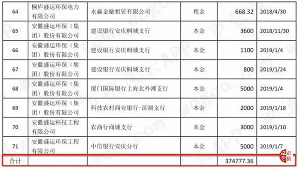 截止2019年2月14日,盛運(yùn)環(huán)保逾期債務(wù)共計(jì)71筆,逾期起始日最早為2017年7月20日,最晚為2019年1月7日,逾期性質(zhì)包括本金、利息、租金和項(xiàng)目貸款等,逾期債務(wù)高達(dá)37.48億元。