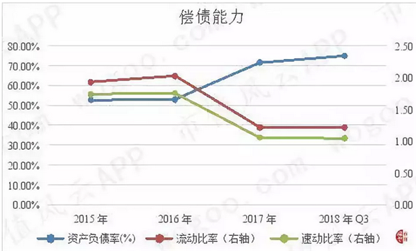盛運(yùn)環(huán)保2015年末至2018年3季度末的資產(chǎn)負(fù)債率分別為52.54%、52.80%、71.40%和74.84%,一路飆升,說(shuō)明公司的償債壓力越來(lái)越大。