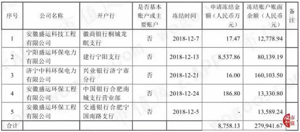 因?yàn)榍穫?、被起訴等,盛運(yùn)環(huán)保及其子公司自2018年3月以來(lái)多個(gè)銀行賬戶被凍結(jié)。