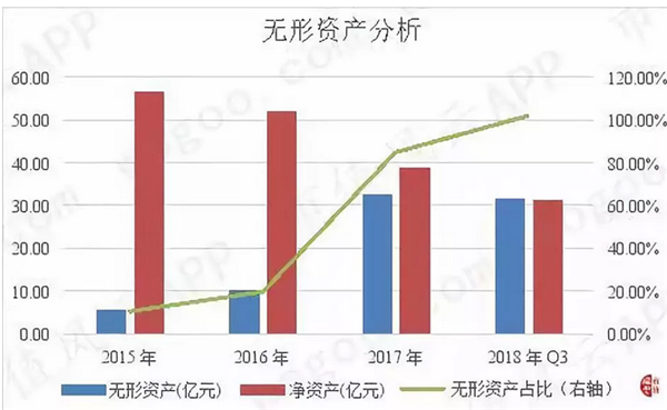 公司2015年末至2018年3季度末的無(wú)形資產(chǎn)金額分別為5.79億元、10.24億元、32.80億元和31.79億元,占公司凈資產(chǎn)的比例分別為10.25%、19.64%、84.28%和101.66%,占比持續(xù)增加,2018年3季度末甚至一度超過(guò)了公司的凈資產(chǎn)規(guī)模。
