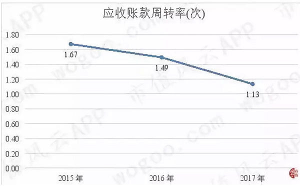 盛運(yùn)環(huán)保2015年至2017年的應(yīng)收賬款周轉(zhuǎn)率分別為1.67次、1.49次和1.13次,不斷下滑,說(shuō)明公司的應(yīng)收賬款管理能力在持續(xù)下降。