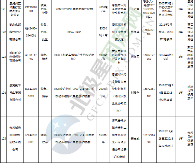 日前湖北省生態(tài)環(huán)境廳發(fā)布了《湖北省危險廢物經(jīng)營許可證》單位名錄(截至2019年2月19日,共125家)。