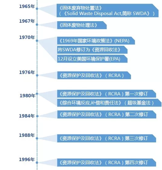 從70年代起,美國以《國家環(huán)境政策法》為基礎(chǔ),成立了國家環(huán)境保護署,制定了《固體廢物處理法》、《資源保護與回收利用法》、《危險廢物管理條例》、《綜合環(huán)境反應(yīng),補償和責(zé)任法》等諸多法律,經(jīng)過多年的發(fā)展,美國環(huán)衛(wèi)行業(yè)相關(guān)法律體系已經(jīng)非常完善。其發(fā)展脈絡(luò)如下圖所示: