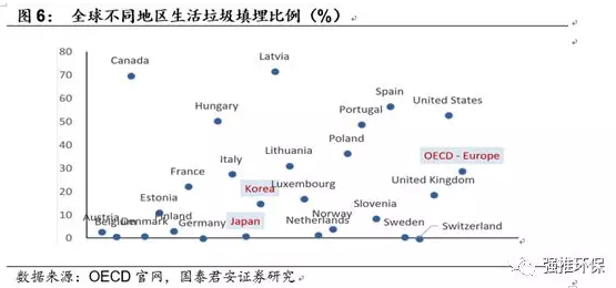 在城市人口密度與中國(guó)較為接近的韓國(guó)、日本、德國(guó)、英國(guó)等國(guó)家,垃圾焚燒+資源回收方式幾乎占據(jù)處置規(guī)模的80%,填埋率均低于20%。其中日本焚燒比例達(dá)77%,歐洲垃圾焚燒占比加權(quán)平均值約27%。