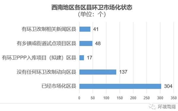 西南五省市區(qū)的512個區(qū)縣中,已經(jīng)實現(xiàn)環(huán)衛(wèi)市場化的區(qū)縣有304個,有環(huán)衛(wèi)PPP入庫或擬建項目的區(qū)縣有17個,有部分鄉(xiāng)鎮(zhèn)或街道試點項目的區(qū)縣有48個,通過各種途徑發(fā)布環(huán)衛(wèi)改制新聞或信息的區(qū)縣有41,尚有137個區(qū)縣未發(fā)現(xiàn)任何環(huán)衛(wèi)試點項目或環(huán)衛(wèi)改制信息。