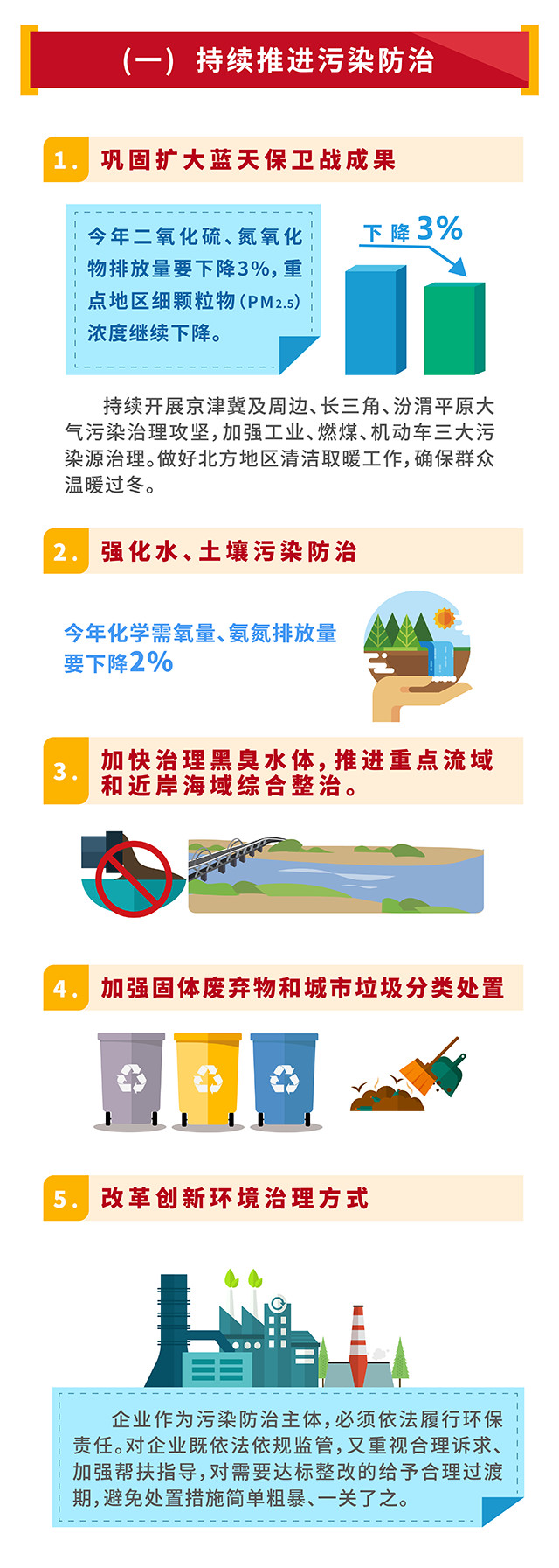 近日,生態(tài)環(huán)境部官方微信整理了今年政府工作報告有關(guān)生態(tài)環(huán)境治理方面的內(nèi)容,包括鞏固擴大藍天保衛(wèi)戰(zhàn)的成果、加快黑臭水體的污染防治等,詳情如下: