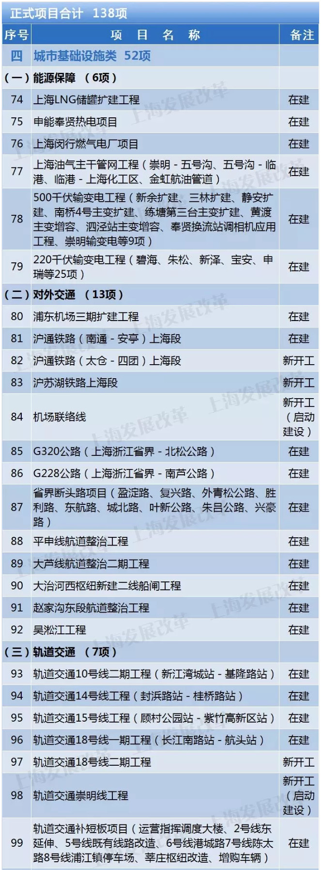 在建45項。包括:上海LNG儲罐擴建工程、浦東機場三期擴建工程、打通省界斷頭路、北橫通道、中心城區(qū)排水系統(tǒng)等。