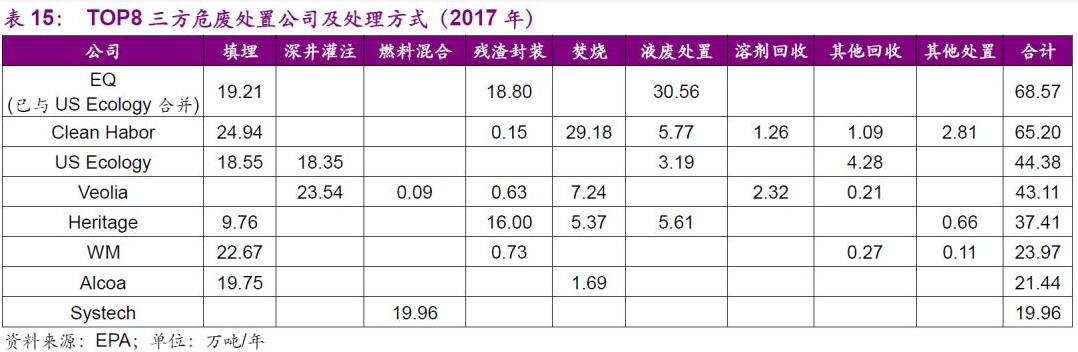 公司在美國,加拿大和墨西哥設有固定設施和服務中心,就危廢三方處置能力來看,2014年前公司處于美國第三位(第一為EQ、第二為CLH)。而2014年6月17日,公司以4.69億美元以小吃大,收購美國三方危廢處置第一大公司EQ Holdings及其全資附屬公司100%股份(2015 年EQ實現(xiàn)危廢處置收入1.99億美元,工業(yè)現(xiàn)場服務1.87億美元,合計3.86億美元),完善了自身的環(huán)境服務能力。收購后,年處理危廢能力為110余萬噸,成為美國危廢三方處置市占率第一的龍頭公司。截至2017年12月31日,六個垃圾填埋場按照壽命剩余容量為3720萬立方米。