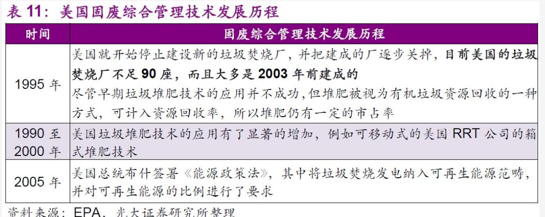 成熟技術為固廢綜合管理發(fā)展提供有力支撐。固廢行業(yè)的技術發(fā)展同樣是制約市場和公司發(fā)展的另一個決定性因素。早在1940年,美國公共衛(wèi)生署(USPHS)便開始推行了一系列固廢處置的技術性試驗,從“衛(wèi)生填埋代替露天堆放”,到“垃圾堆肥的探索和試驗”,再到“垃圾焚燒”,最后到了如今大力推廣的“廢物能源回收”的綜合利用。