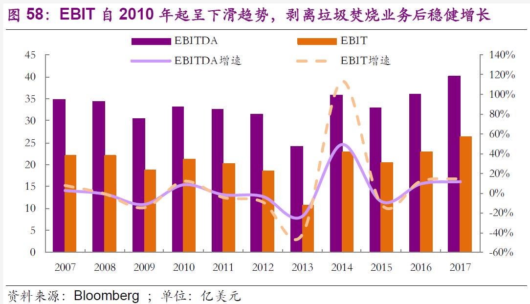 公司2017年垃圾處理量高達1.13億噸,實現(xiàn)營業(yè)收入145億美元,EBIT和EBITDA分別為26和40億美元。公司2017年固廢營業(yè)收入居全球第一,領先第二名威立雅達70%,而這一切都建立在公司僅在美國和加拿大運營的基礎上,充分展現(xiàn)出公司在固廢領域的絕對統(tǒng)治力。