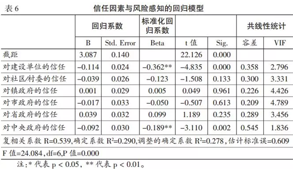 由表 5 可知,兩個(gè)變量的容差均處于區(qū)間(0,1)內(nèi),方差膨脹系數(shù)(VIF)值均在 4.000 以下,未大于評(píng)鑒指標(biāo)值 10,表明進(jìn)入回歸方程式的自變量間多元共線性問(wèn)題不明顯。從回歸模型可以看出,個(gè)人利益感知、公共利益感知均與風(fēng)險(xiǎn)感知呈顯著的負(fù)相關(guān)關(guān)系,這表明利益感知因素顯著影響風(fēng)險(xiǎn)感知;居民的個(gè)人利益感知和公共利益感知的程度越低,風(fēng)險(xiǎn)感知越強(qiáng)烈。H2 得到驗(yàn)證。
