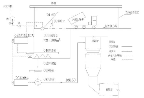 整個污泥輸送系統(tǒng)由污泥儲存系統(tǒng)、泵送系統(tǒng)及PLC自動控制系統(tǒng)組成。工藝流程詳見下圖。