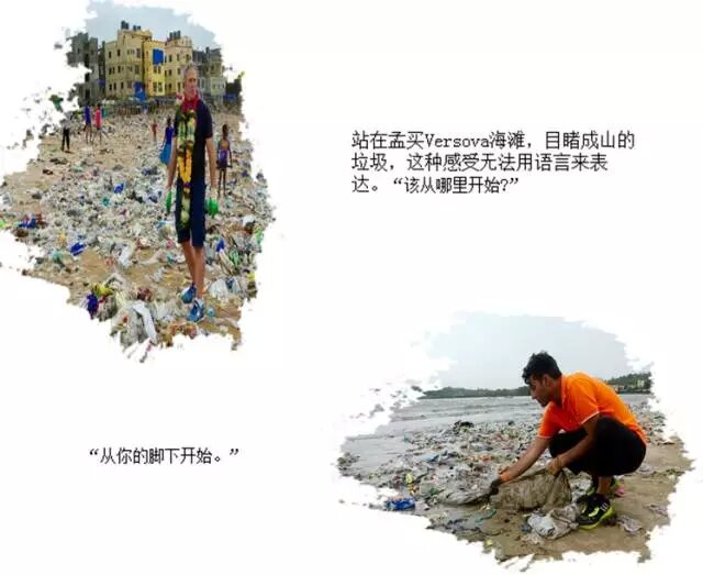 我不得不提醒自己,這里——是海灘——然而海灘的沙子深埋在垃圾和污物之下。這些垃圾有我的腳踝那么深,將我的腳面完全覆蓋。在舒適的家中看照片和親臨現(xiàn)場是完全不同的體驗。此時此刻,站在孟買Versova海灘,目睹成山的垃圾,面對著赤裸裸的真相,這種感受無法用語言來表達(dá)。該從哪里開始?