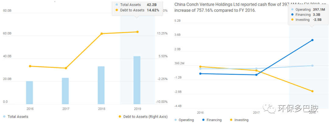 正是出身于這樣一個大家庭,公司成立之初,不僅繼承了海螺良好的管理團(tuán)隊和文化,同時,海螺水泥優(yōu)秀的財務(wù)表現(xiàn)還使得公司享受穩(wěn)定投資收益和分紅,擁有殷實財務(wù)報表(低負(fù)債、高回款和充足現(xiàn)金),可以說是在環(huán)保行業(yè)中是別具一格的富二代,這二者為海螺創(chuàng)業(yè)日后的成功奠定了扎實的基礎(chǔ)。