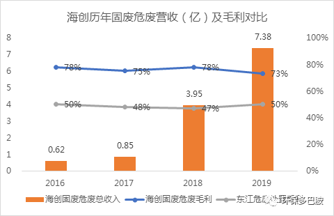 與之對應(yīng)的是收入猛增。從2016年堯柏環(huán)保并表、正式為公司帶來6198萬收入起,到2019年增加至7.38億元,4年收入增長12倍!與此同時,憑借水泥窯的先天優(yōu)勢及公司管理能力,其毛利基本維持在75%的高水平段位,顯著高于危廢處置龍頭東江環(huán)保的毛利水平(約49%),協(xié)同處置帝國輪廓初步顯現(xiàn)。