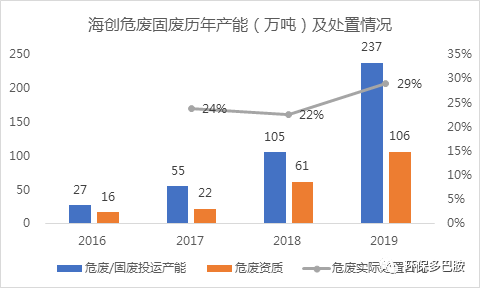 從2016年公司第一個危廢項目(陜西富平項目)投產(chǎn)開始,僅以投運(yùn)產(chǎn)能計算,公司固廢及危廢產(chǎn)能迅猛增長,從2016年的27萬噸固廢產(chǎn)能(含危廢)迅猛增加至2019年的237萬噸,增長778%,危廢資質(zhì)從16年的16萬噸猛增至19年的106萬噸(是榜眼金隅的一倍),增長546%。
